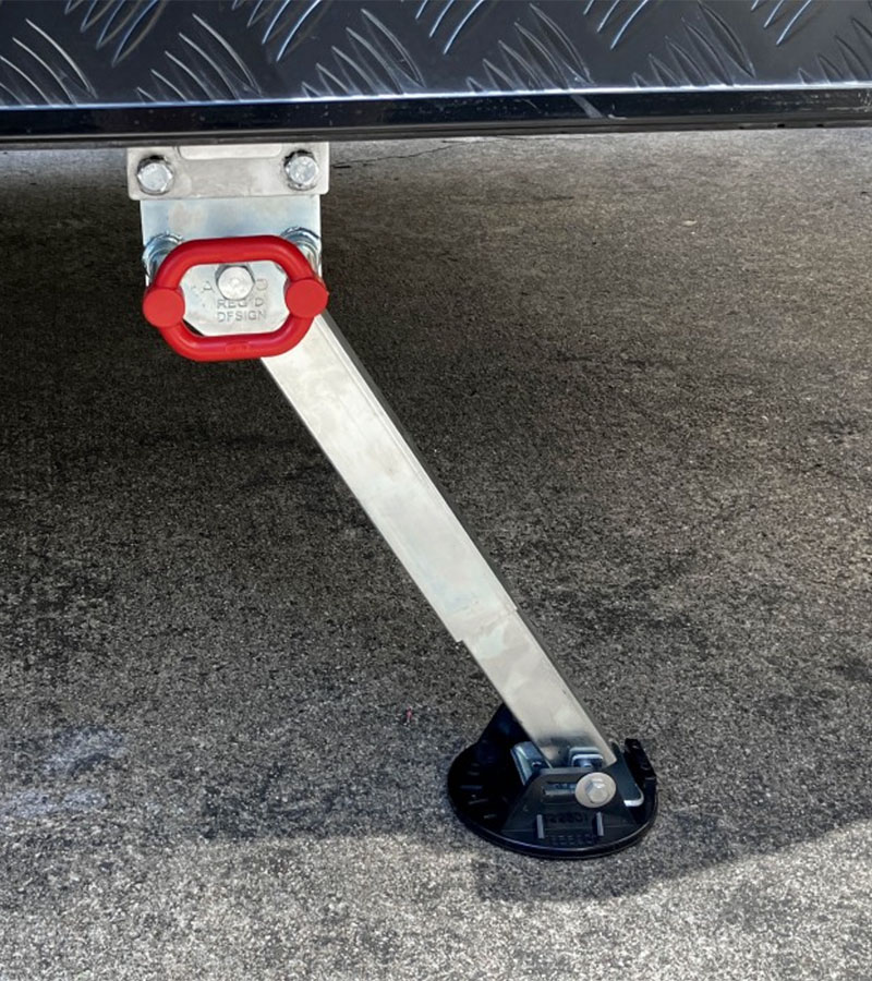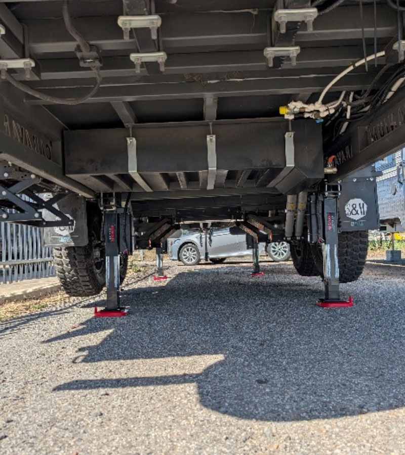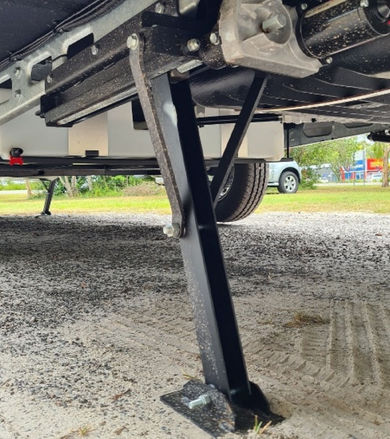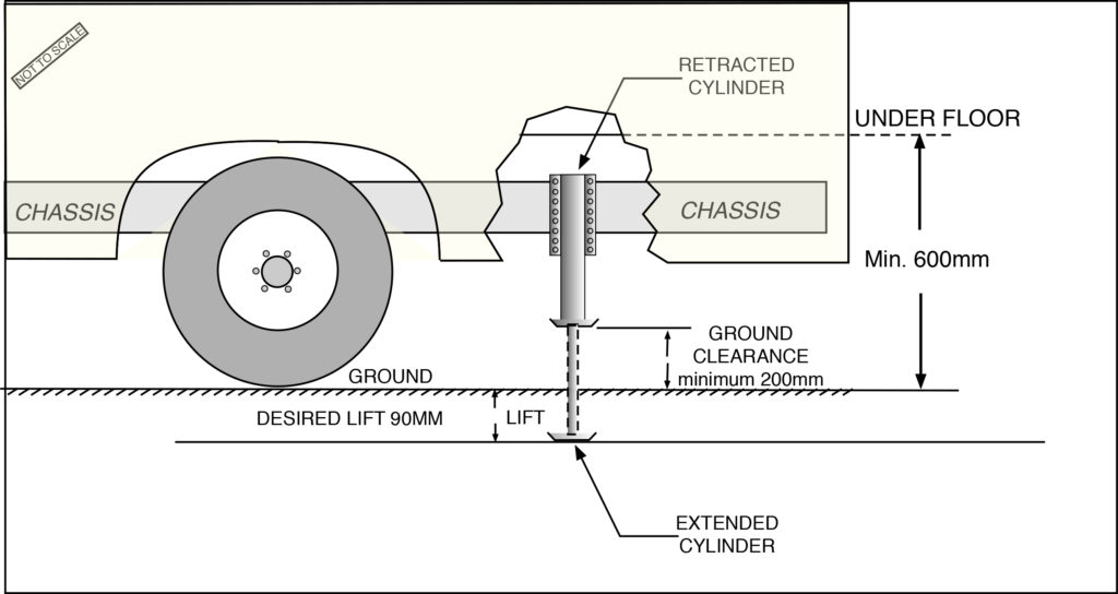 The primary use of Levelling jacks, is to lift and level the vehicle without using additional stabiliser legs, eliminating vehicle movement. Levelling jacks automatically find level on uneven surfaces and if required, allows the operator to lift wheels off the ground.